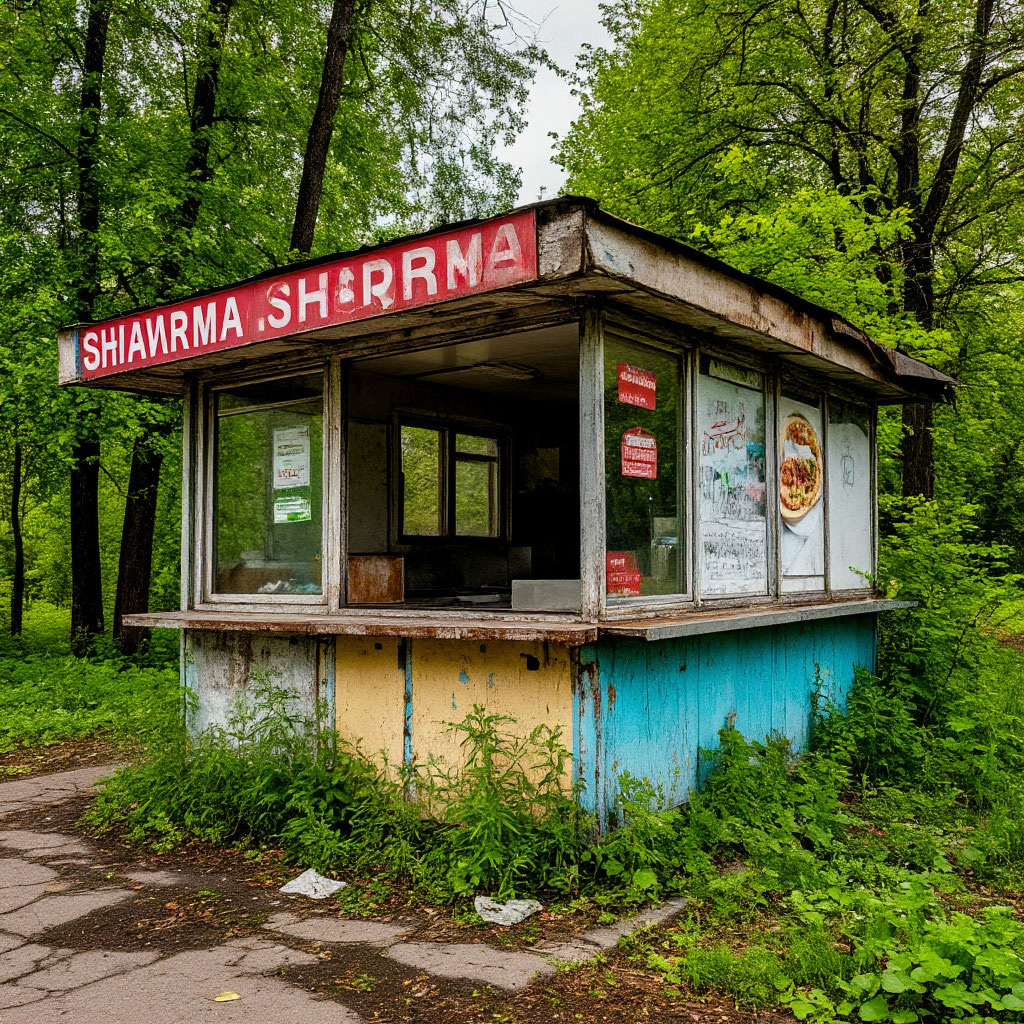 В глубине Сосновского лесопарка, там, где тропинки разбегаются в разные стороны, словно испуганные зайцы, стоял старый ларек. Когда-то он источал ароматы свежей шавермы, привлекая голодных студентов и усталых путников . Теперь же его выцветшая вывеска «Шаверма 24/7» казалась насмешкой над временем, а разбитые витрины смотрели на мир пустыми глазницами.