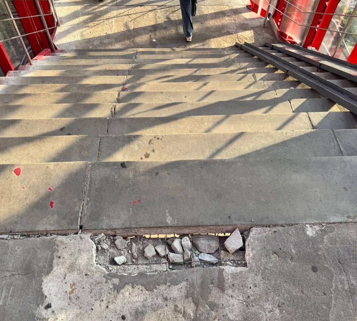 📩📤📥📨✉️Новый пешеходный мост на ж/д вокзале в Серпухове уже разваливается. Ступени крошатся, арматура вылезла наружу и грозит переломать ноги прохожим. Рабочие «произвели восстановительные работы»: кинули немного цемента и доску сверху. Позорище! 😀 Подпишись на Чехов Вид ✅Поддержать голосами 📲Прислать новость