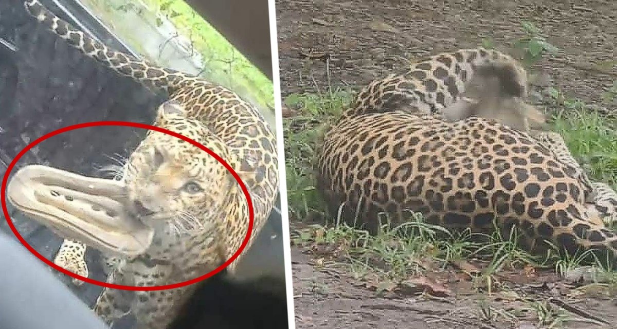 Игривый леопард хватает туриста за шлёпанцы на сафари в Таиланде