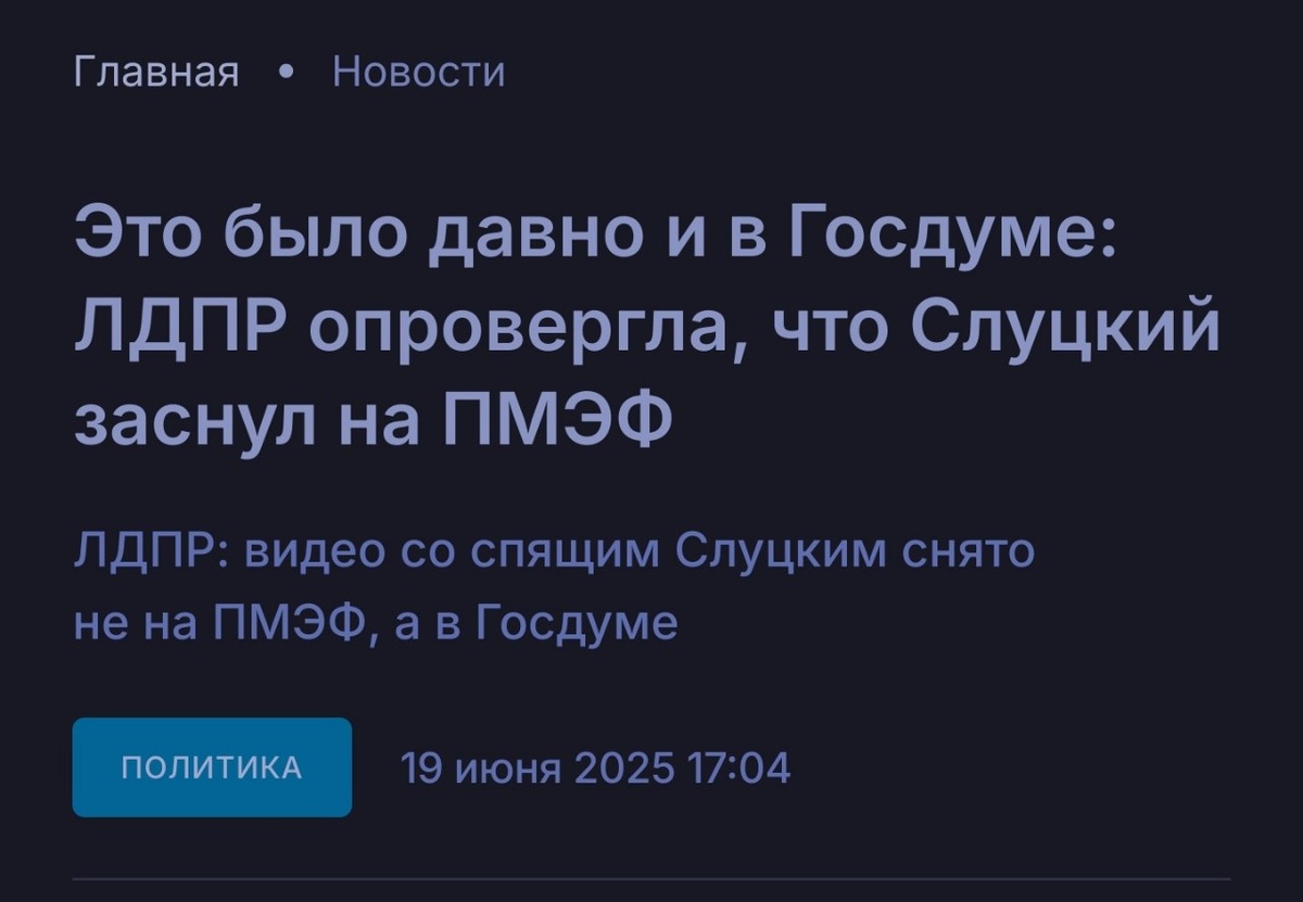 ⚡️ Срочная новость: ЛДПР опровергает, что Слуцкий уснул на сессии ПМЭФ, и утверждает, что он так спал не на ПМЭФ, а на одном из мероприятий в Госдуме.