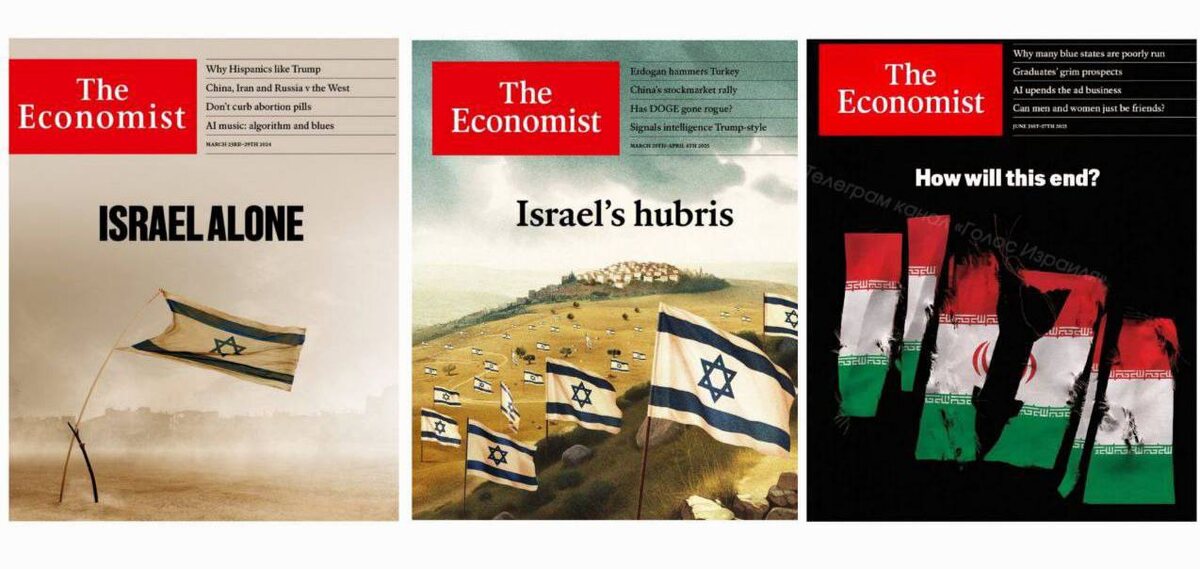 Обложка The Economist в марте 2025 (в центре), после прихода Трампа: «Новый неудержимый Израиль, который меняет форму региона. Его враги больше не могут его сдержать, а его друзья не будут его отговаривать».