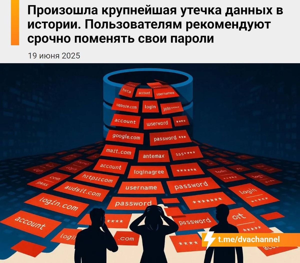 Хакеры выложили в открытый доступ гигантскую базу паролей от Apple, Google, Instagram, Facebook, GitHub, Telegram и других сервисов. Это не просто старая утечка — там много свежих данных, которых раньше не было в сливах. Что делать? ✔️ Срочно меняйте пароли — особенно на важных аккаунтах (почта, банки, соцсети). ✔️ Не используйте один и тот же пароль на разных сайтах. ✔️ Включите двухфакторную аутентификацию (2FA) — это сильно усложнит взлом. ✔️ Проверьте свои данные на утечки через сервисы вроде [Have I Been Pwned](https://haveibeenpwned.com/). Предупредите родных и друзей — многие даже не знают, что их данные уже в Сети. 🔐 Безопасность — не паранойя, а необходимость. Не откладывайте на потом — злоумышленники уже могут проверять ваши логины и пароли в автоматическом режиме.
