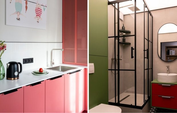 Вдохновляйтесь и берите на заметку! Перед дизайнером Полиной Чернышовой стояла задача создать интерьер, который бы вызывал эмоции и не оставлял равнодушным. Требовалось оформить двухкомнатную квартиру для сдачи в аренду, комфортную для проживания двух-трех человек. Показываем интересные решения из проекта, которые сделали эту двушку по-настоящему уникальной. Кухню объединили с гостиной — это сделало пространство более светлым и просторным. Вход в кухню расположен со стороны гостиной, а между ними установлена раздвижная дверь кассетного типа, что позволяет гибко разделять и объединять зоны. Для спальни выбрали обои с принтом медузы и растительным сюжетом. Это создает ощущение глубины и уюта, погружая в атмосферу спокойствия и комфорта, что особенно важно для пространства, предназначенного для отдыха. В зоне обеденной группы использован прием колор-блок. Этот подход добавляет визуальный интерес и разнообразие в интерьер. Выделение обеденной зоны помогает создать динамичное пространство,