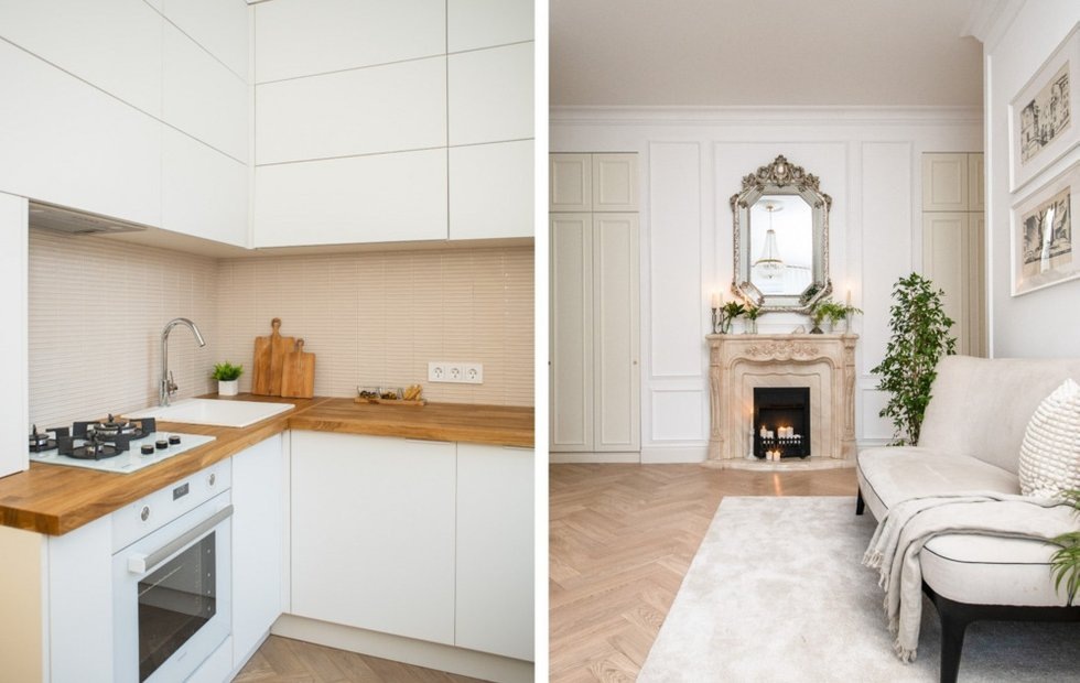 Дизайнер Ольга Семашева обустроила светлый интерьер в дореволюционном доме, сохранив дух эпохи Дизайнер Ольга Семашева спроектировала интерьер для молодой семейной пары. Квартира находится в дореволюционном доходном доме. Главной задачей было обустроить отдельную спальню, место для встречи с друзьями, кабинет и изолированную кухню. Стилистика квартиры продиктована ее исторической атмосферой. Ольга успешно объединила элементы классической архитектуры с современными дизайнерскими решениями. Все комнаты и кухня остались в своих размерах, но планировка изменилась с линейной на круговую с анфиладами. Смежное расположение создало ощущение простора и воздушности. Когда двери между комнатами открыты, свет из соседних окон наполняет помещения. В результате получился длинный коридор, отдельная кухня, спальня, гостиная, кабинет и совмещенный санузел. На кухне площадью 6 кв. м удалось разместить все необходимое. Белый гарнитур с деревянной столешницей создает уютную атмосферу. Верхние фасады распо