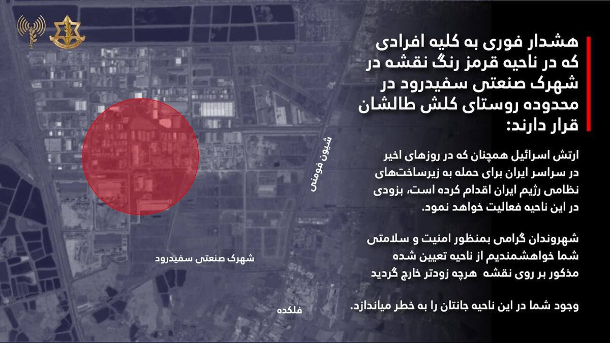 Армия выпустила очередное распоряжение об эвакуации: «Срочное предупреждение всем, кто находится в зоне, отмеченной красным, в промышленном парке Сефидруд, в районе деревни Келеш Талашан: Израильская армия, которая в последние дни наносит удары по объектам режима Ирана по всей стране, вскоре начнёт активные действия и в этом районе. Дорогие граждане, в целях вашей безопасности и сохранения жизни, мы просим вас немедленно покинуть указанную на карте зону. Ваше присутствие в этой зоне подвергает вашу жизнь серьёзной опасности».