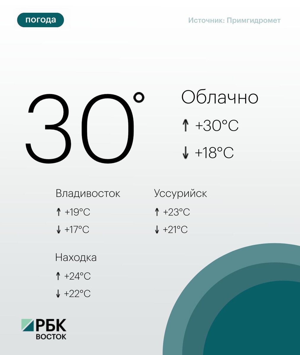 Сегодня погоду в Приморье определяет поле повышенного атмосферного давления. Днём небольшой, местами умеренный дождь, на юго-западе сильный. На северо-востоке без осадков. В отдельных районах гроза. Ветер юго-западный, южный умеренный до сильного, на южном побережье очень сильный. Температура воздуха +18...+30°C 🌧 Во Владивостоке облачно, утром морось, днём во второй половине дождь, вечером сильный. Утром местами туман. Ветер юго-восточный утром и днём сильный, вечером очень сильный. Температура воздуха +17...+19°C. 😃Подписывайтесь на РБК Восток