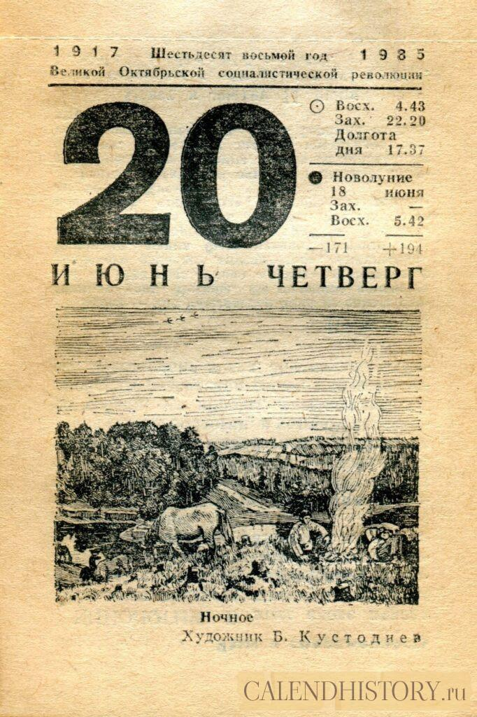 Итак, сегодня 20-го июня и у нас на календаре 1985-й год. Перед нами листок советского календаря для женщин. На календаре у нас четверг - 20 июня 1985-го года. Ночное Художник Б. Кустодиев *** Оборотную сторону листка этого календаря можно посмотреть у нас по ссылке на сайте. Другие листки советских календарей смотрите у нас на сайте - CALENDHISTORY.ru ПОСМОТРИТЕ ЕЩЁ ЛИСТКИ ОТРЫВНЫХ КАЛЕНДАРЕЙ: