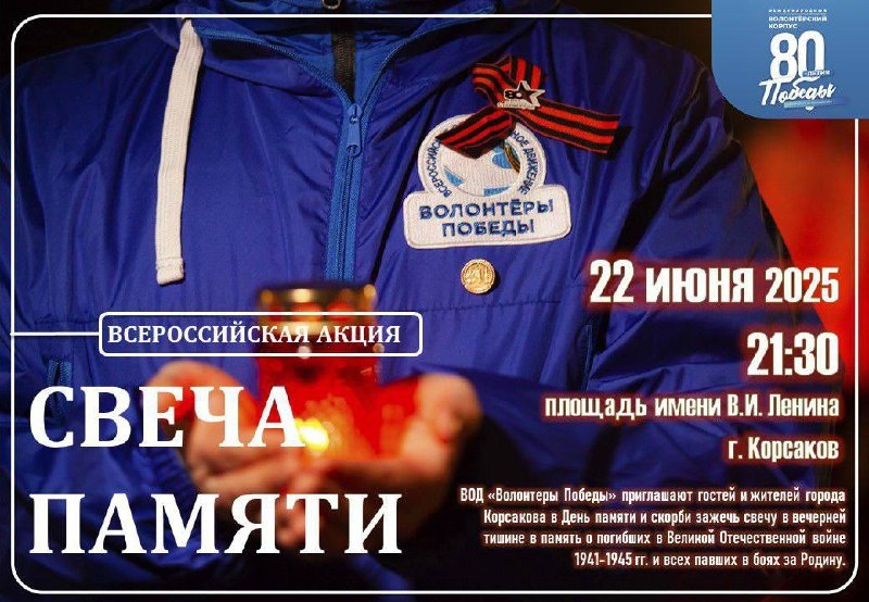 Уважаемые жители и гости Корсаковского округа! 🕯️Приглашаем вас почтить память героев, чьи жизни унесла Великая Отечественная война. В этот день памяти и скорби мы зажжём свечи и вместе вспомним тех, кто навсегда остался в нашей истории. Акция памяти состоится 22 июня 2025 года в 21:30 на площади имени В.И. Ленина. 🔥84 года назад в этот день мир изменился навсегда. Для миллионов людей жизнь разделилась на «до» и «после». Но пока мы помним – их подвиг не забыт, их жертва не напрасна. @cmi_korsakov65
