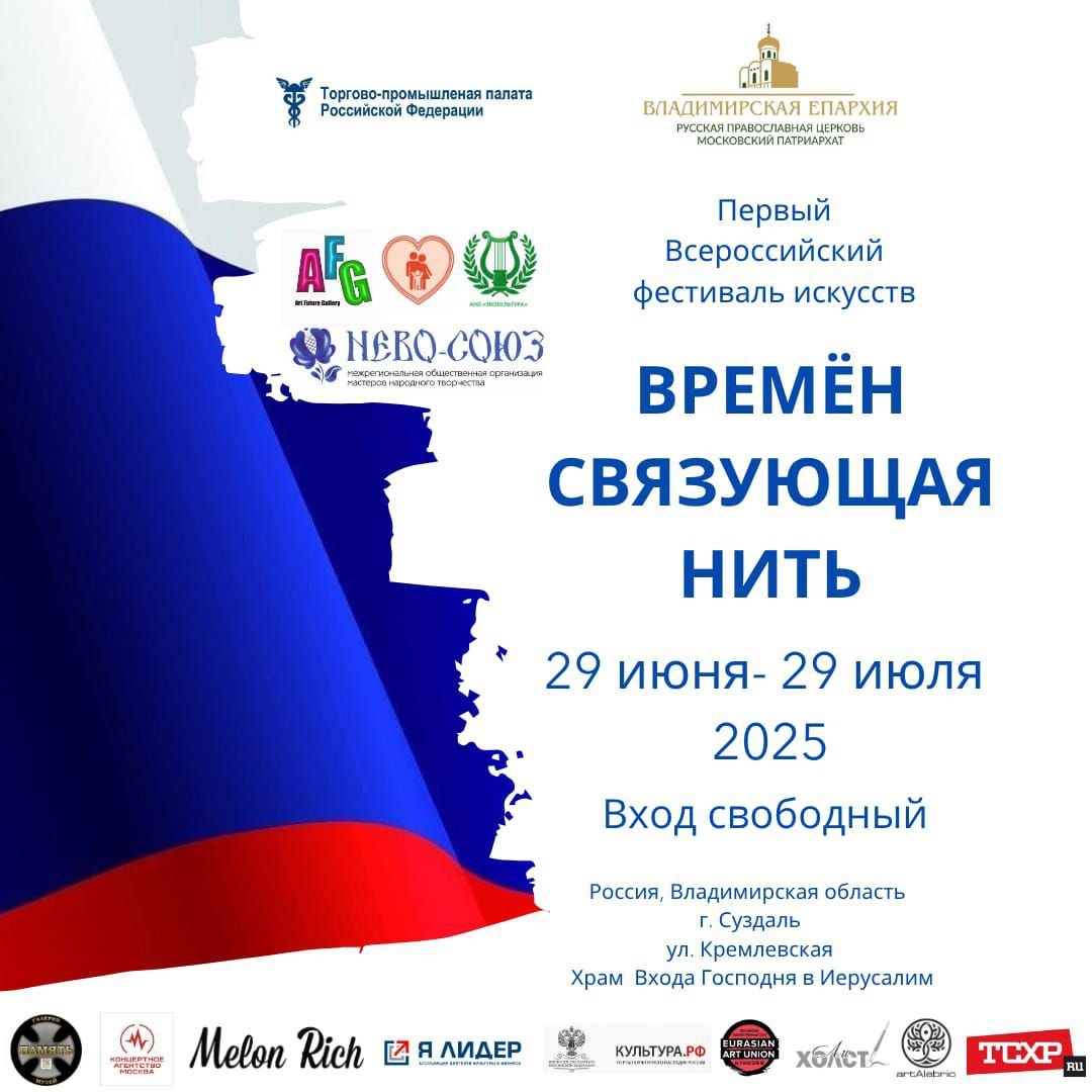 Open-call: Всероссийский Фестиваль искусств «Времён связующая нить» 29 июня – 29 июля 2025 г. г. Суздаль, Входо-Иерусалимская церковь Дорогие художники, иконописцы, скульпторы и мастера изобразительного искусства! Приглашаем вас принять участие в масштабном проекте — Всероссийском Фестивале искусств «Времён связующая нить», который откроется в одном из самых живописных и духовно значимых мест России — древнем Суздале, в стенах Входо-Иерусалимской церкви. Важно! Выставка стартует в Суздале, а затем отправится в тур по городам России, превратившись в по-настоящему всероссийский арт-проект. Это уникальная возможность для ваших работ быть увиденными тысячами зрителей в разных регионах страны! О фестивале Искусство во все времена служило мостом между прошлым и будущим, сохраняя вечные ценности: любовь, семью, дружбу, духовную силу народа. От древних икон до современных произведений — оно продолжает нести добро, свет и мудрость, несмотря на смену техник, материалов и стилей. Наша выс