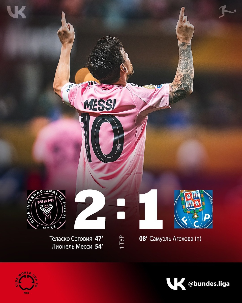 Месси вытащил матч для «Интер Майами» 👏 В матче 2-го тура группы А встречались «Интер Майами» (США) и «Порту» (Португалия). Матч закончился со счётом 2:1 в пользу хозяев. ⚽ 0:1 Агехова – 8' ⚽ 1:1 Сеговия – 47' ⚽ 2:1 Месси – 54' На 54-й минуте нападающий и капитан «Интер Майами» Лионель Месси вывел свою команду вперёд, забив красивейший гол со штрафного. Волевая победа команды Маскерано! 👍 #FIFACWC