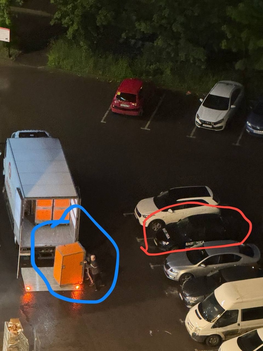 На Ленинградской в пол первого работники при разгрузке уронили коробку на черный автомобиль.