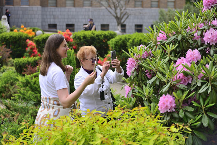Особенно разнообразна и впечатляюща палитра рододендронов в сквере у областного краеведческого музея. Оранжевые, нежно-розовые, белые с пестрыми вкраплениями шапки цветов сосредоточены в основном в посадках вокруг главного фонтана. Но отдельные кустарники и деревца украшают и другие уголки сквера.