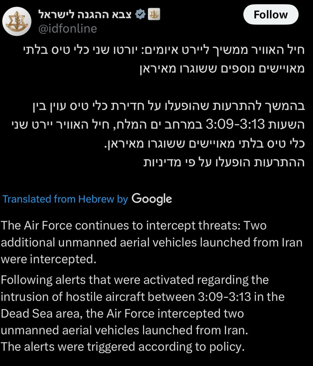 В ответ на пост IDF claims two drone aircrafts INTERCEPTED ‘in the Dead Sea area… launched by Iran’