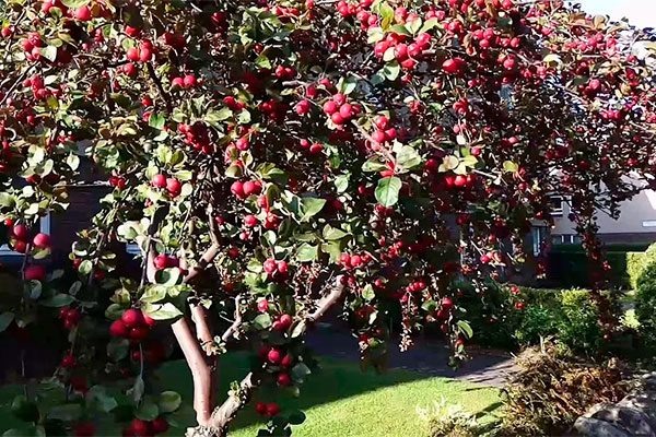 Весной покрывается множеством крупных нежно-розовых цветков, а с середины лета до осени украшена яркими, декоративными яблочками.