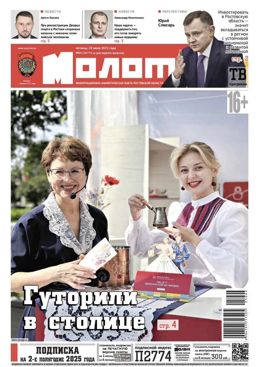 Встречайте свежий номер газеты «😜олот» ✍ Гуторили в столице На международном туристическом форуме «Путешествуй!» донской регион научил москвичей и гостей столицы традиционному верхнедонскому гутору. А еще мастерили головные уборы — кички, где небольшие выпуклости в виде двух рогов символизируют благополучие и богатство. Подробности — у Елены Бондаренко. ✍ Век в небе над Доном Сто лет назад из Ростова-на-Дону в небо поднялся первый гражданский самолет. Одномоторная машина взяла курс на Москву, открыв не просто воздушный маршрут, а новую эпоху — с ее романтикой, трудом, подъемами и приземлениями. На торжественном приеме в честь юбилейной даты побывал Александр Оленев. ✍ Руины во мгле События на Парамоновских складах в Ростове взбудоражили и простых горожан, и общественников. Недавно там звучали выстрелы, а потом на дореволюционных живописных развалинах появилась копоть. Дело в том, что на территории памятника архитектуры федерального значения снимается художественный фильм. Что стане