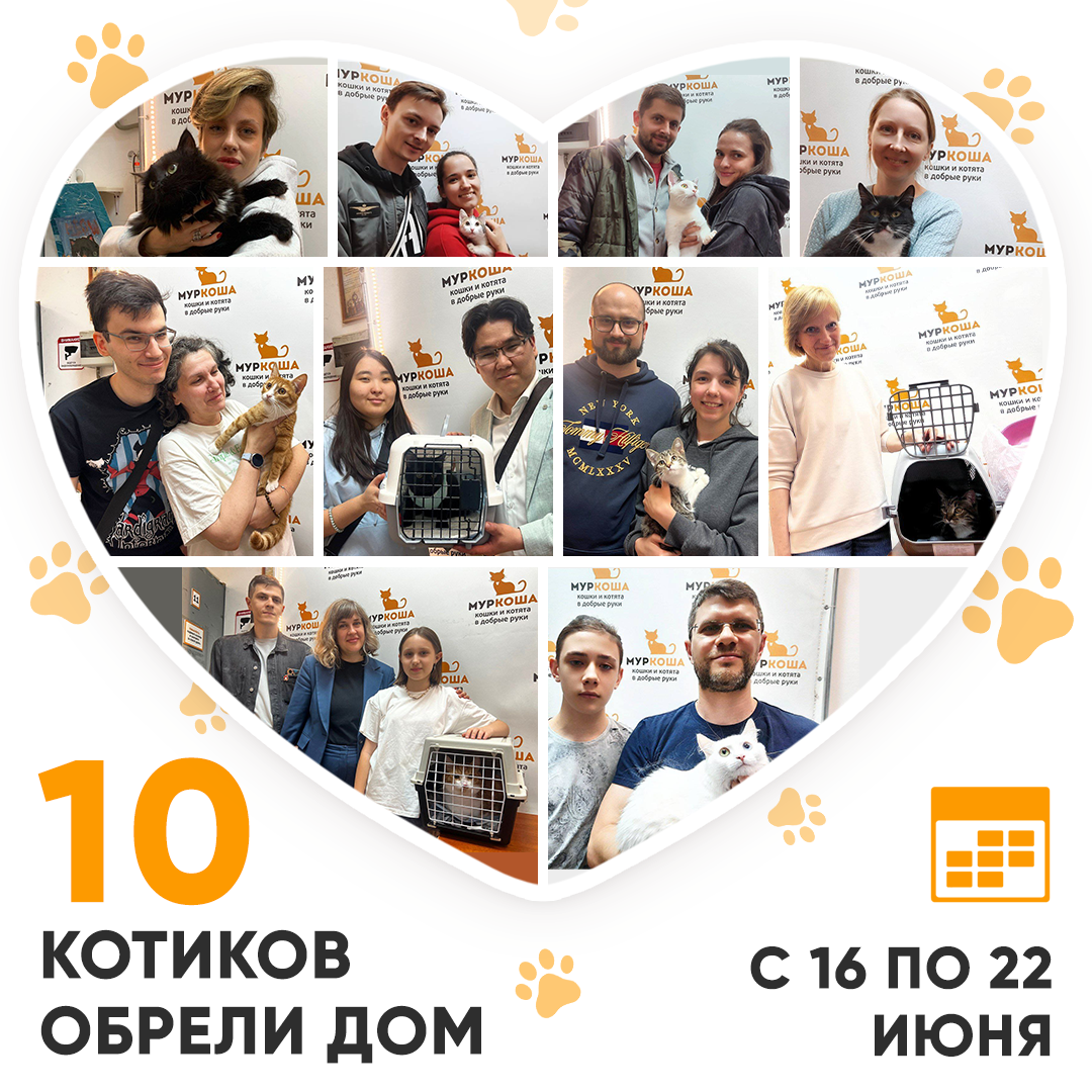 Друзья! Сегодня среда, и мы, как обычно, подводим итоги работы «Муркоши» за прошедшую неделю. Кто же стал счастливым выпускником Центра помощи кошкам «Муркоша» с 16 по 22 июня 2025 года? 😺 🥳 Итак, за прошедшую неделю домашними и любимыми стали 10 котиков! Яркая рыжая Милоуз жила на улице. Оттуда кошечку доставили в приют, чтобы она смогла обрести семью. И вот, за Милоуз приехали те самые люди! У них дома также живёт наш выпускник Гильфи! Пушинка Цицилия тоже скиталась по улицам. Приехав в «Муркошу», ласковая кошечка сразу поняла, что обязательно станет домашней. Недавно на Цицилию и обратила внимание заботливая хозяйка! И Чебз жил на улице. К счастью, этому котику подарили шанс на счастливую жизнь. Пробыв в приюте всего два месяца, Чебз уютно устроился на ручках у доброй семьи! Чтобы адаптироваться и довериться людям, Беате потребовалось время. Тем не менее, кошечка знала, что за ней придёт прекрасная хозяйка. На прошлой неделе так и произошло – девочка уехала в дом, в котором жив