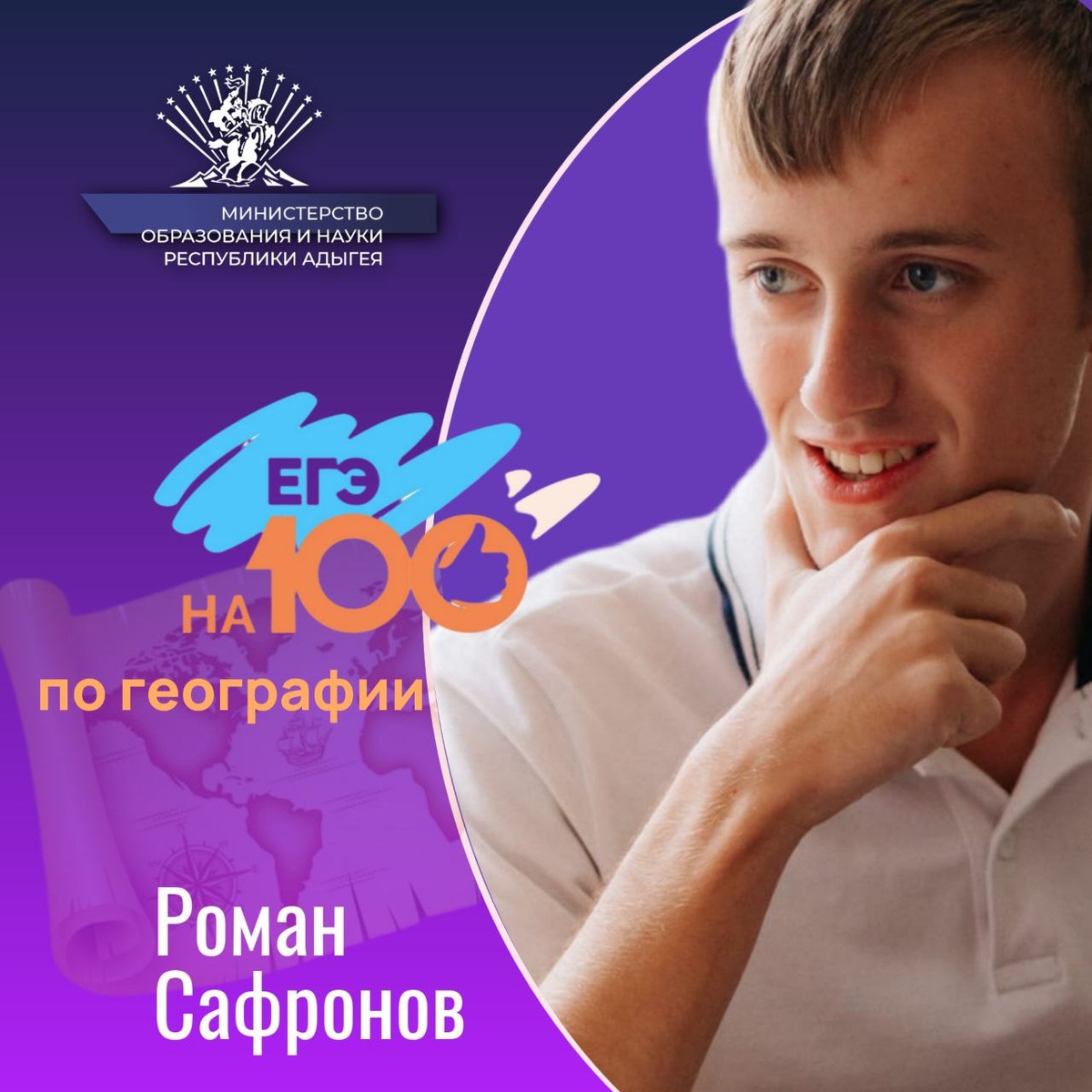 Сафронов Роман, выпускник МБОУ "СШ №7" г. Майкоп, набрал 100 баллов ЕГЭ по географии. На протяжении всех лет учебы Роман отличался терпением, упорством, желанием достичь поставленной цели. И эти замечательные качества помогли ему добиться больших успехов. В 2024-2025 учебном году Роман стал победителем муниципального и призером республиканского этапов Всероссийской олимпиады школьников по географии. Пожелаем Роману удачи! Пусть все его мечты сбудутся!