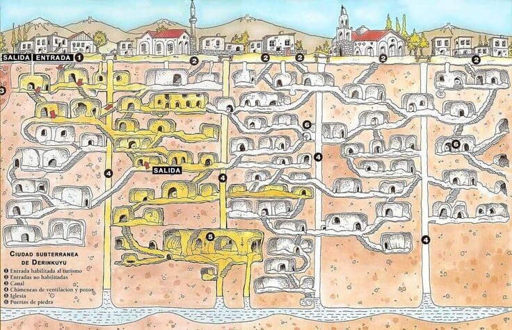 Глубоко под землёй, в самом сердце Турции, скрыт один из самых таинственных и поразительных памятников древности — подземный город Деринкую. Это не просто укрытие, а настоящий мегаполис древнего мира, построенный в породе вулканического туфа на глубине более 60 метров. Здесь, словно в настоящем подземном улье, веками скрывались целые общины людей, от врагов, стихий и, возможно, от чего-то большего… В 1963 году, один житель города Деринкую делал ремонт у себя дома. Снося стену подвала, он неожиданно обнаружил необычное пустое пространство — туннель, уходящий в глубину скалы. Любопытство взяло верх, он продолжил расчищать камень. За первым проходом открылся второй, потом третий… а затем целые комнаты, лестницы и вентиляционные шахты! Мужчина сообщил о находке властям и обнаружилось, что под городом скрыт многоуровневый лабиринт — с комнатами, школами, кухнями, колодцами, церквями и даже системой вентиляции. С тех пор город был частично расчищен, укреплён и открыт для туристов. Сегодня мо