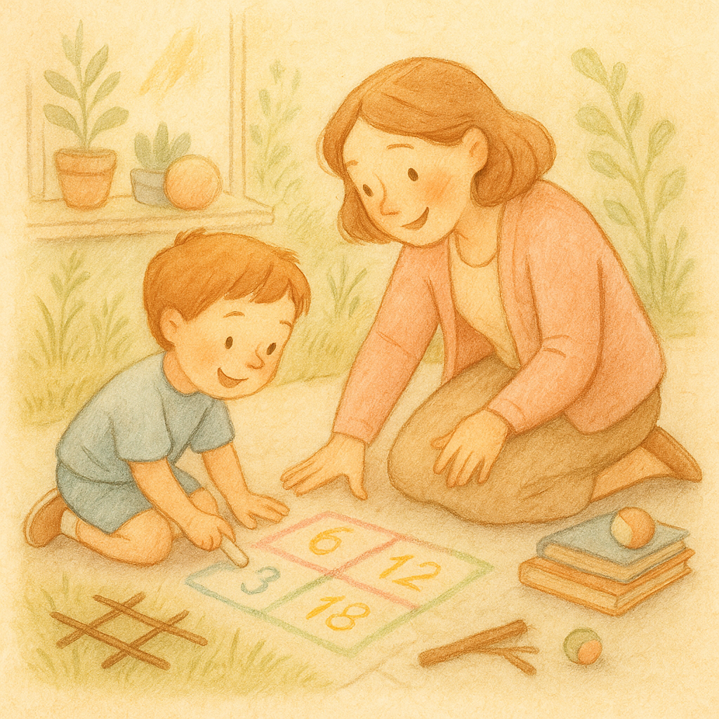 Рисуем мелом змейку клеток. В каждой — результат: 6, 12, 18. Перед прыжком ребёнок называет пример. Ошибся — возвращается на старт. Не исправляйте сразу: дайте пять секунд на самопроверку — дофамин от разгадки сильнее десятка похвал.