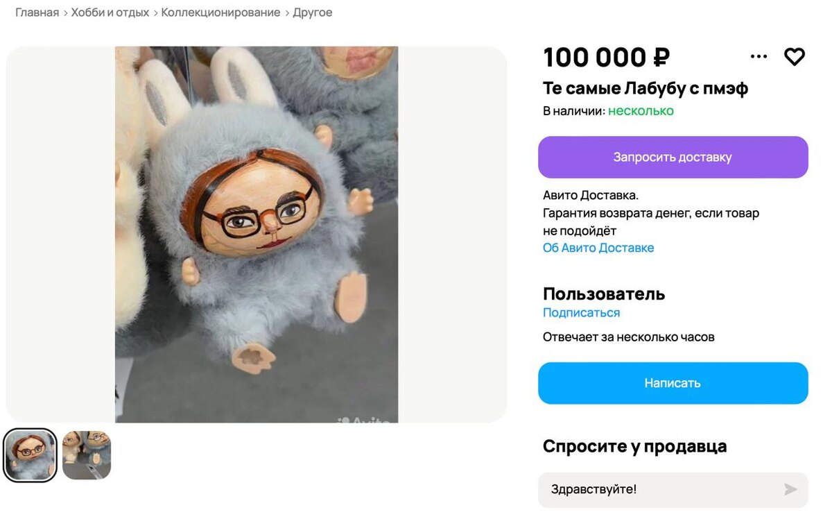 В ответ на пост За скромные 100 тыс. рублей продают кастомные Лабубу с ПМЭФ-2025 на «Авито». Продавец в объявлении пишет, что в наличии имеется сразу несколько игрушек. Но если вам дорого — не беда. В 20 раз дешевле Лабубу продают в одном из московских переходов. Адрес не скажем, самим надо. ⭕️ Подписаться | Прислать новость | Буст