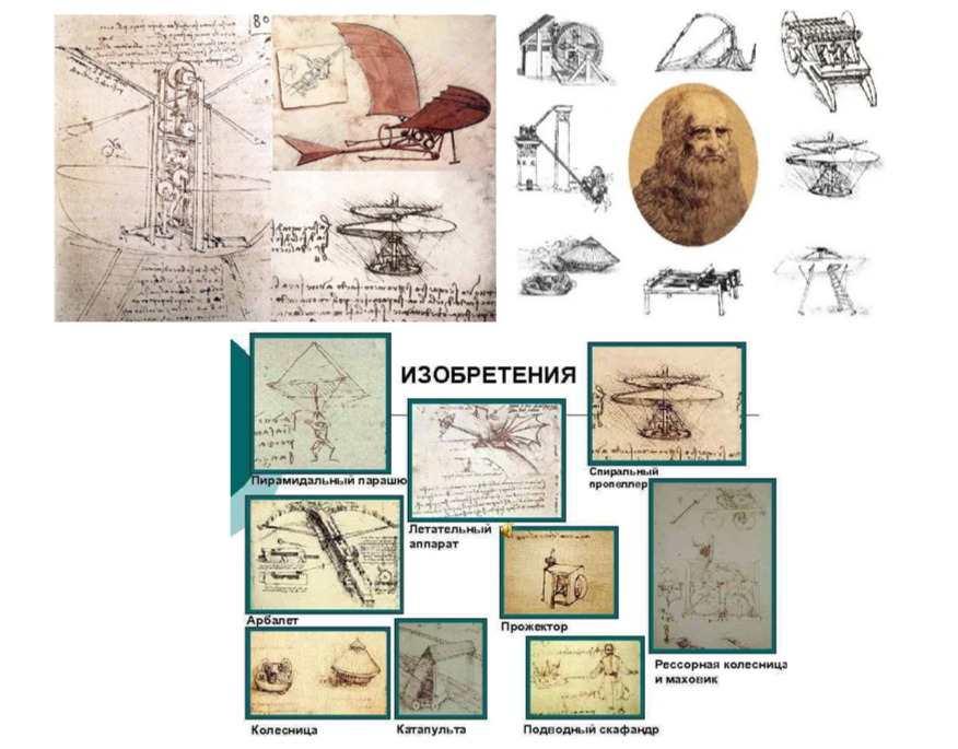 Вот как выглядели эскизы некоторых механизмов и устройств (а их более сотни!!!) гения эпохи Возрождения Леонардо да Винчи (1452-1519гг.). Разработанные им модели летательных аппаратов так и не построили, но чертежи сохранились.
