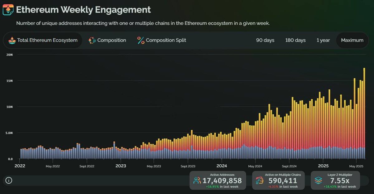 You can't look away from $ETH right now! 🚀 Ethereum's weekly engagement just soared to a new all-time high, breaking all previous records