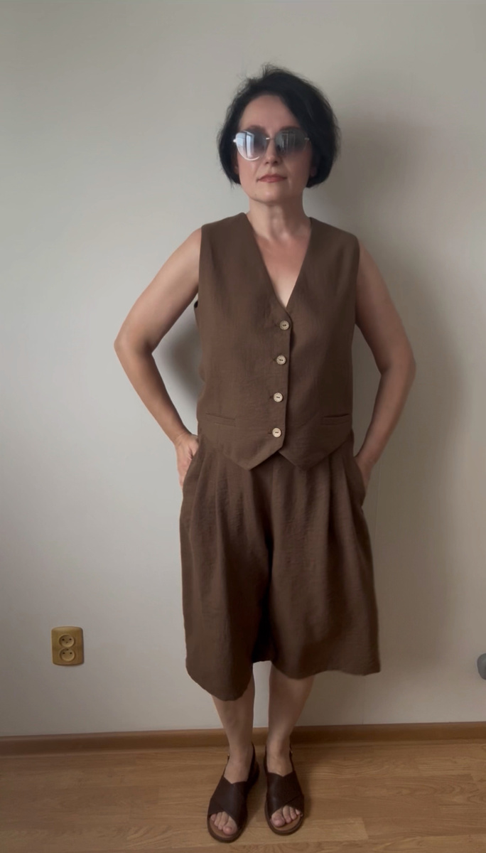 Да, летом все повально носят жилет и шорты-бермуды. Это именно тот костюм, который сделает летний образ современным и комфортным. И теперь он у меня есть. Костюмный жилет – безусловный тренд летнего сезона. Его используют не только как дополнение к образу, но и как основную деталь гардероба, надевая на голое тело. Бермуды же настолько часто встречаются на подиумах, что сложно понять, являются ли они актуальным трендом или уже базой летнего гардероба, подобно классическим летним брюкам. С ними можно создать не только пляжные, но и городские образы в стиле "тихой роскоши", а также успешно интегрировать их в гардеробы женщин старше 50 лет. Идеальная длина бермудов - чуть-чуть выше колена, но я критично отношусь к своей фигуре и у меня есть вопросики к своим коленям, поэтому я их наоборот чуть-чуть прикрываю. Мой костюм - из журнала Patrones 3/2024. ткань - лен с вискозой с крэш-эффектом в сложном коричнево-оливковом оттенке. Цвет и фасон костюма настолько универсальны, что мне удалось пр