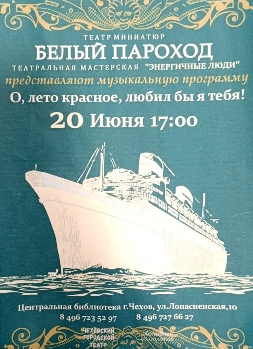 ✨ Концерт «О, лето красное, любил бы я тебя!» 🎶Музыкальная программа от театра миниатюр «Белый пароход» и театральной мастерской «Энергичные люди» ☀️Почувствуйте атмосферу летнего праздника, солнца и музыки. 🚫 Возраст: 6+ 📆 20.06.2025 🕛 17:00 🏢 Центральная библиотека 📍 г. Чехов, ул. Лопасненская, д.10 🪙 Вход свободный❗️ #webЧехов ⭐Разместить публикацию ⭐Поддержать канал голосом ✅ Мероприятия Чехов https://dzen.ru/id/66cc4b48e9ef144699238a51 http://vk.com/chekhov_events http://dzen.ru/chekhov_events