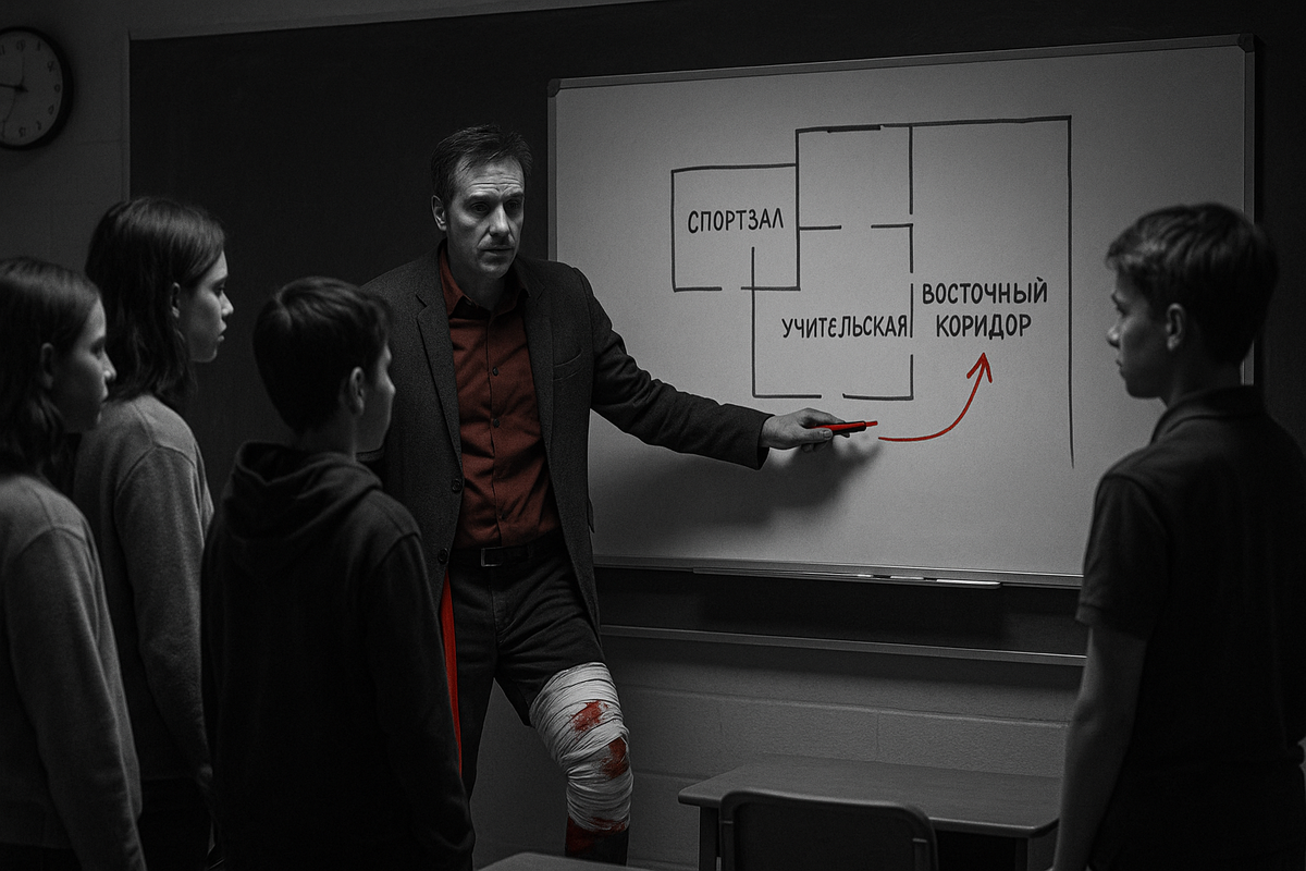 Я начинаю рисовать на доске: «Это школа, это спортзал, а тут — учительская». Рана на ноге кровоточит — я знаю, что они это видят. Я останавливаюсь, чтобы подтянуть самодельный бинт.