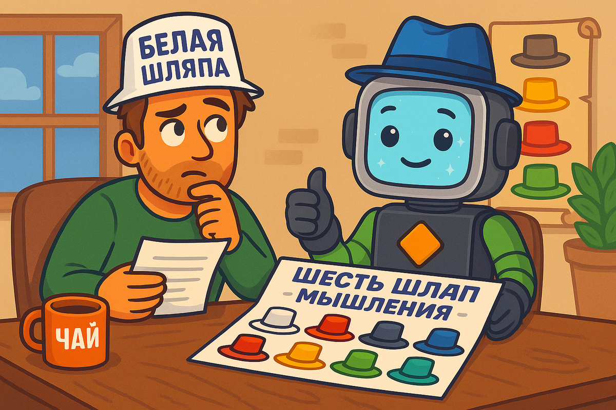 Была идея. Крутая. С тем самым щелчком в голове — «надо делать». Я проснулся в хорошем настроении, заварил чай, открыл ноутбук, поставил плейлист, который обычно помогает сосредоточиться... и замер. Голова работала, но как будто вразнобой. Сначала пошёл энтузиазм — «это гениально!», потом тревога — «а если никто не купит?». Потом голос мамы в голове: «опять ты в свою авантюру». А потом пустота. Никакого плана. Только каша из эмоций, обрывков идей и неуверенности. Я тупо уставился в экран, пока чай остыл. И подумал: а как вообще выбраться из этого мысленного болота? Метод, о котором читал ещё в студенчестве. Он казался слишком структурным. Слишком «по учебнику». Но теперь — стал спасением. Я начал с белой шляпы — только факты: Потом надел жёлтую — где плюсы?