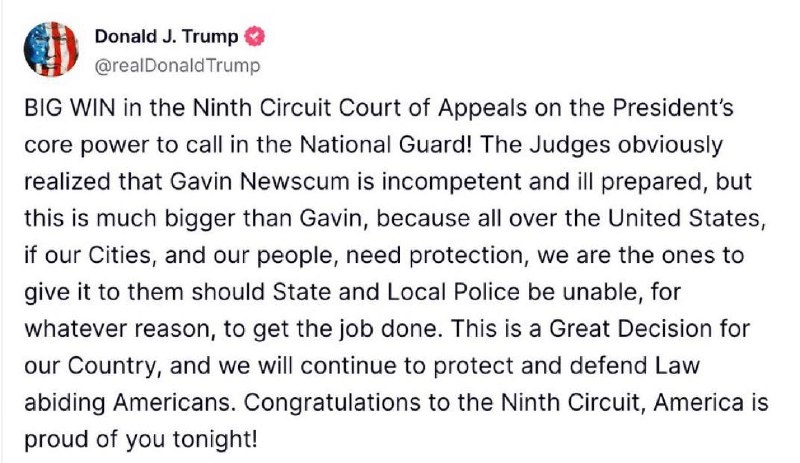 В ответ на пост ‘BIG WIN in the Ninth Circuit Court of Appeals’, Trump applauds win in California National Guard case ‘The Judges obviously realized that Gavin 'Newscum' is incompetent and ill prepared’ ‘This is much bigger than Gavin’