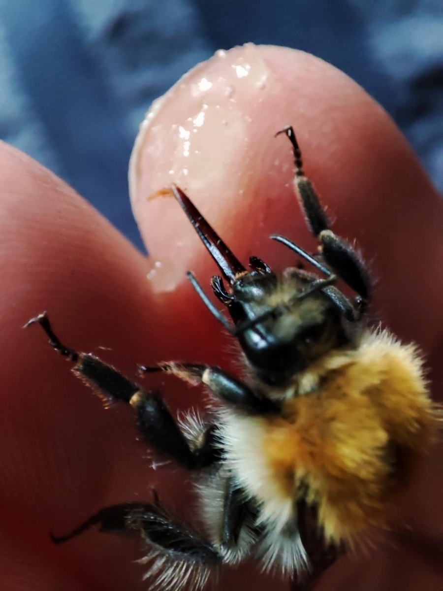 Вечером вижу — на подоконнике шмель, сгорбился и явно тоскует. Потыкала его пальцем — живой! Тут же растопырился и стал на меня лапами махать грозно — не подходи, зашибу! Отлегло. Уж, думала, помер. Со шмелями, пчёлами такое бывает. Горючее кончается, короткий голод — и прощай. Спасти такого зверя не составляет труда. Взяла каплю мёда, сунула вояке. Он в палец вцепился, высунул язычок и мёд подлизал. Щекотно так. Успела и телефон взять, пока он силы восстанавливал. Видите, у него язык в чехле — сначала выдвигается чехол, а из него нежный гибкий хлыстик. У шмелей очень длинный язык. Длиннее, чем у пчёл. Поэтому им больше разных цветов доступно. Клевер, например. Пчёлы его могут подгрызть сбоку, а шмель длинным клювом и так достаёт. Увидите такого полудохлого — покормите его сладкой каплей. Цветы вам спасибо скажут.