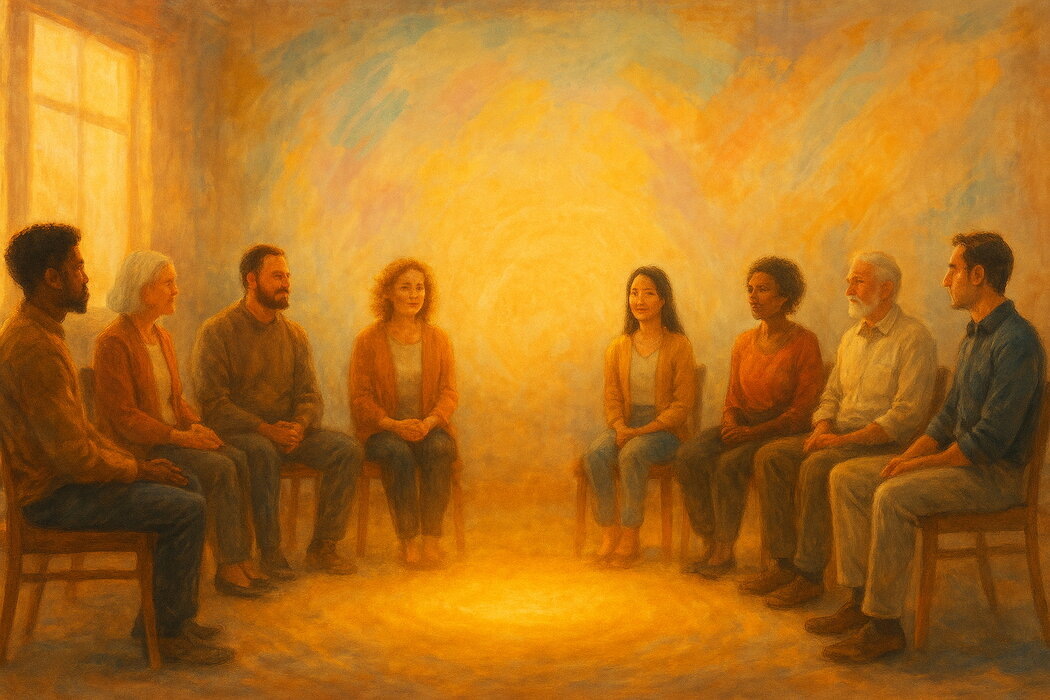 Группа может дать то, чего нет ни в индивидуальной терапии, ни в семье, чувство глубокого узнавания и принятия. Когда один участник делится своей историей, другой вдруг понимает, что его собственная боль не уникальна. Возникает чувство солидарности и единства. Специальные ритуалы безопасности: конфиденциальность, отсутствие критики, поддержка взглядом или даже молчанием - формируют доверие. Иногда достаточно того, чтобы просто посидеть рядом, подержать за руку и дать человеку почувствовать, что он не один. Через эти моменты простого и искреннего контакта рождается глубокое доверие, позволяющее участникам группы раскрывать свои уязвимые стороны без страха.