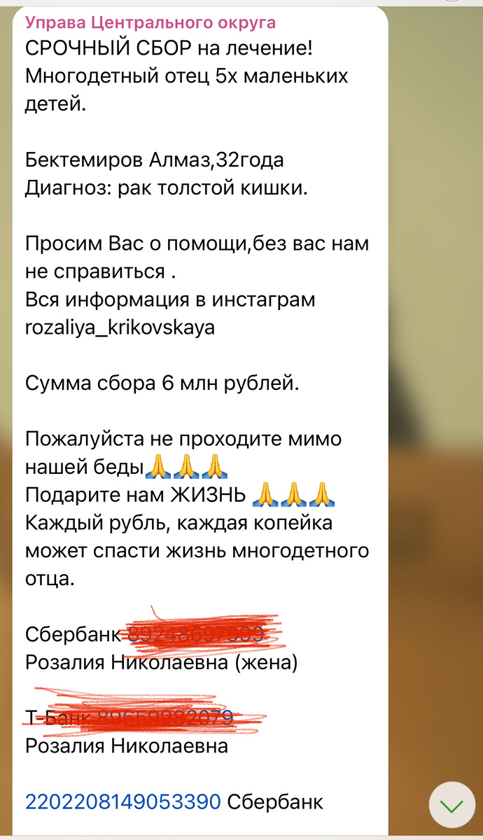 Жила-была семья . Муж и жена, дети. Внезапно муж заболевает раком , при этом жена продолжает рожать от него детей. Родили таким образом пятерых. Болезнь то уходит в ремиссию, то возвращается . В 2024 году рак кишечника достиг терминальной стадии, но семья продолжает вести сборы. В итоге мужчина умирает в феврале 2025 года. Как видно по объявлению , присутствуют признаки токсичного сбора , в частности давление на жалость. О состоянии больного не говорится, но на момент написания объявления он уже был в финальной стадии рака. В инстаграме семьи выложены фото , где больной страдает. Не знаю, сколько людей участвовало в этих сборах, но неработающая мать пяти детей на что-то живёт и не парится. На вопрос, куда пошли деньги после смерти мужа, жена даёт грубый ответ, мол "я не должна перед вами отчитываться". Допустим, лично передо мной не обязана, так как я денег не перечисляла, однако те, кто действительно отправлял деньги "на лечение", могут и спросить. Посмотрим, как она будет отвечат