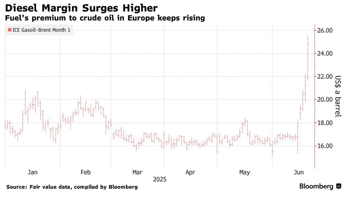 Цены на дизельное топливо резко выросли пятый день подряд, превысив эквивалент $105 за баррель в Европе - Блумберг Пока не критично, но тенденция интересная. Страх продолжает рулить рынком. Если в первой серии на стене висит ружьё, то в третьей оно выстрелит