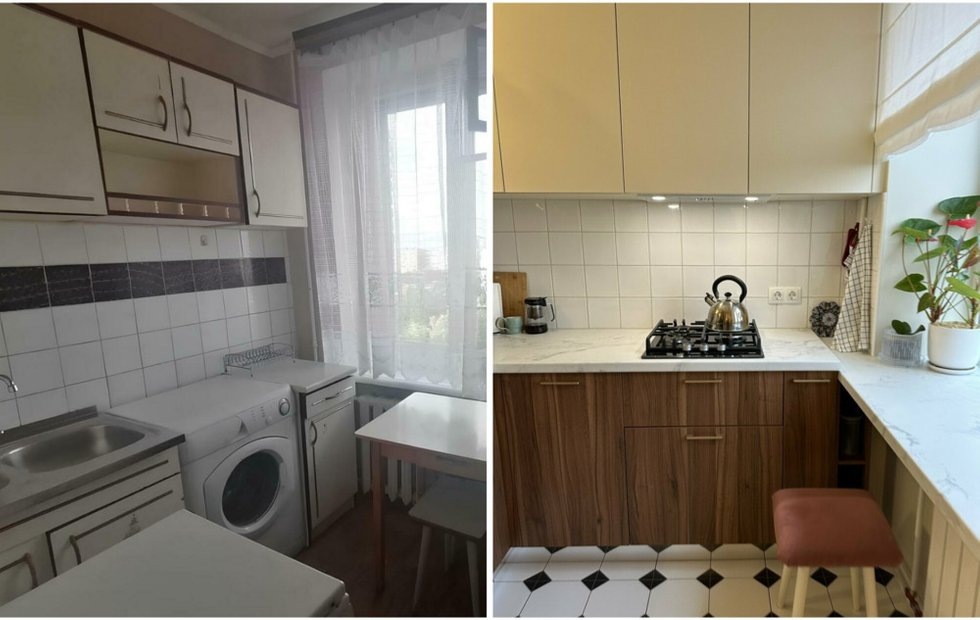 В исходной планировке квартиры кухня была больше, чем в стандартных хрущевках и панельках того времени — «такая она была просторная», как отмечает Ксения. Но в процессе перепланировки всей квартиры кухня уменьшилась. Изначально хозяйка даже хотела объединить ее с гостиной.