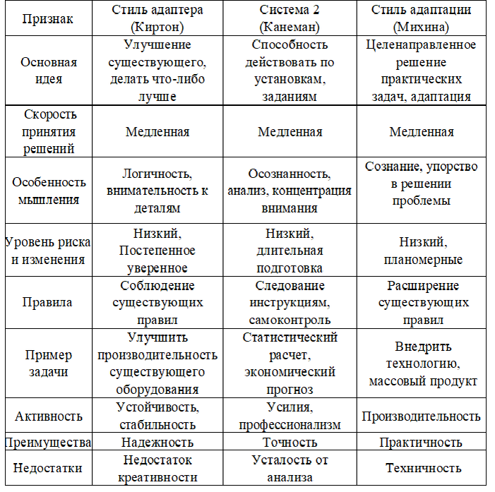 Таблица 2 Сравнение стилей: инноватора, система 1, самоопределения