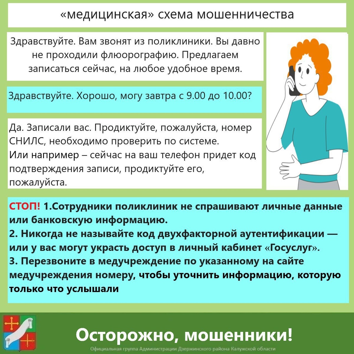 Мошенники постоянно совершенствуют свои методы. Они тщательно готовятся, ловко расставляя ловушки. Один из самых распространенных видов мошенничества – вишинг, или мошенничество при помощи телефонного разговора. Цель злоумышленника - заставить человека раскрыть конфиденциальную информацию, которая поможет украсть деньги: трехзначный код банковской карты, код для входа на портал «Госуслуги», данные паспорта. Пример «медицинской» схемы мошенничества смотрите в карточке. Будьте бдительны, не дайте себя обмануть! #Тема_дня_информационная_безопасность