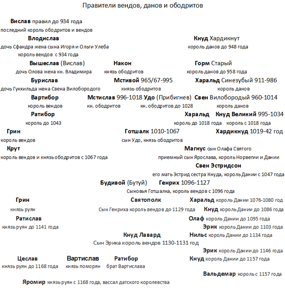 Предложенная выше реконструкция королей ранов или руян-вендов, которых новгородцы называли варягами, основывается на средневековых источниках, скандинавских сагах и работе Иоганна Хемница «Родословная герцогов Мекленбургских». В отличие от династий королей данов и ободритских князей большинство имен правителей вендов пришлось восстанавливать, что не может не вызвать возражений, но прямых источников о них на сегодня нет. Отсутствуют какие-либо источники даже о первом их короле после распада государства ободритов и вендов в 934-936 годах. Причем для историков раннее королевство вендов как бы, вообще не существует, а их более позднее государственное образование они именуют державой вендов. Хотя Адам Бременский писал: «Они (раны-венды) первенствуют среди всех славянских народов, имеют короля и знаменитое святилище». Более подробно этот вопрос разберем позже, а сейчас вернемся к родословной вендских королей, которая вероятно берет начало от князя острова Рюген или Руяна Вислава, брата перво