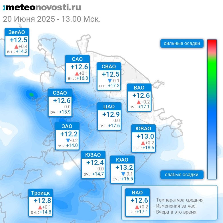 В 13:00 в Москве было от +12.2°C до +13.4°C, средняя температура +12.7°C #погода #Москва #лето #температура #20июня #пятница