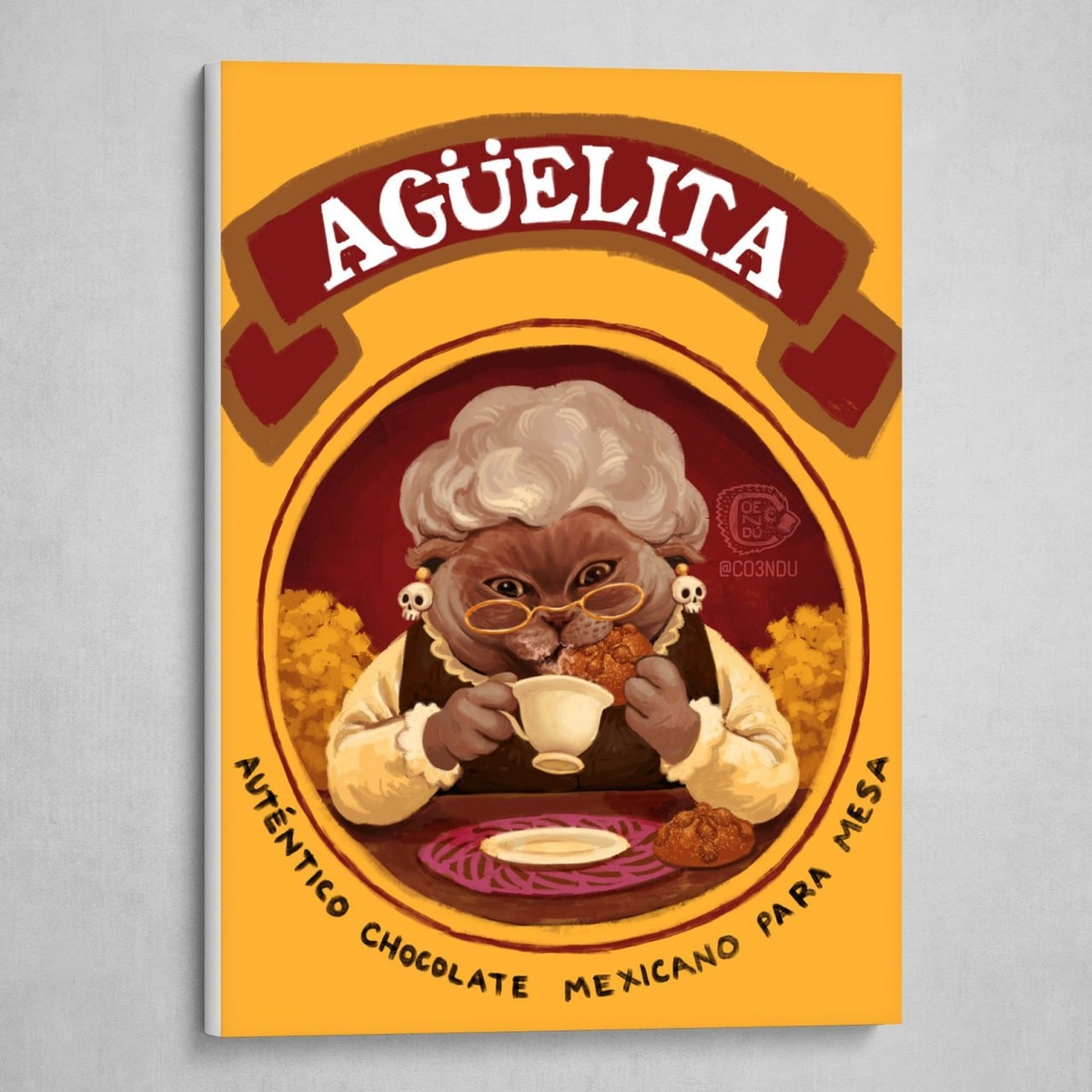 В этой работе уют встречается с мифом. Кошка в образе бабушки — это нежный символ памяти, любви и тихих семейных традиций. Она держит чашку горячего шоколада с таким же вниманием, как мы держим дорогие воспоминания. Пан-де-муэрто не просто хлеб, а мост между мирами, и здесь он становится частью теплого, почти волшебного ритуала.