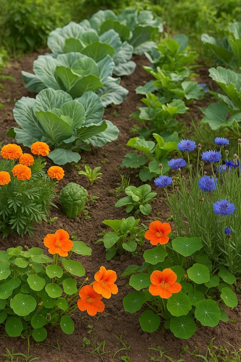 Считается, что на грядке должно быть строго и по делу — морковка к морковке, огурец к огурцу. Но опытные дачники знают: цветы на огороде — это не только красота, но и большая польза. Они могут защитить овощи от вредителей, привлечь опылителей, улучшить микроклимат и даже обогатить почву. Расскажу, какие цветы я сажаю рядом с овощами у себя на участке, и зачем я это делаю. Без химии, без сложностей — просто проверенные практики. - 🌼 Настурция — природный щит для капусты, томатов и картофеля Настурция — мой незаменимый союзник в борьбе с вредителями. Почему я её сажаю: • Отпугивает тлю, белокрылку, капустную моль и колорадского жука; • Отлично растёт по краю грядок; • Быстро нарастает и служит «живым барьером»; • А ещё — съедобна! Цветки и листья можно добавлять в салаты. 📍 Куда сажать: по краям грядок с капустой, томатами, картошкой. - 🌻 Бархатцы — защита от нематоды и мушек Бархатцы (тагетес) известны как лучшие санитарные цветы огорода. Преимущества: • Их корни выделяют вещества,
