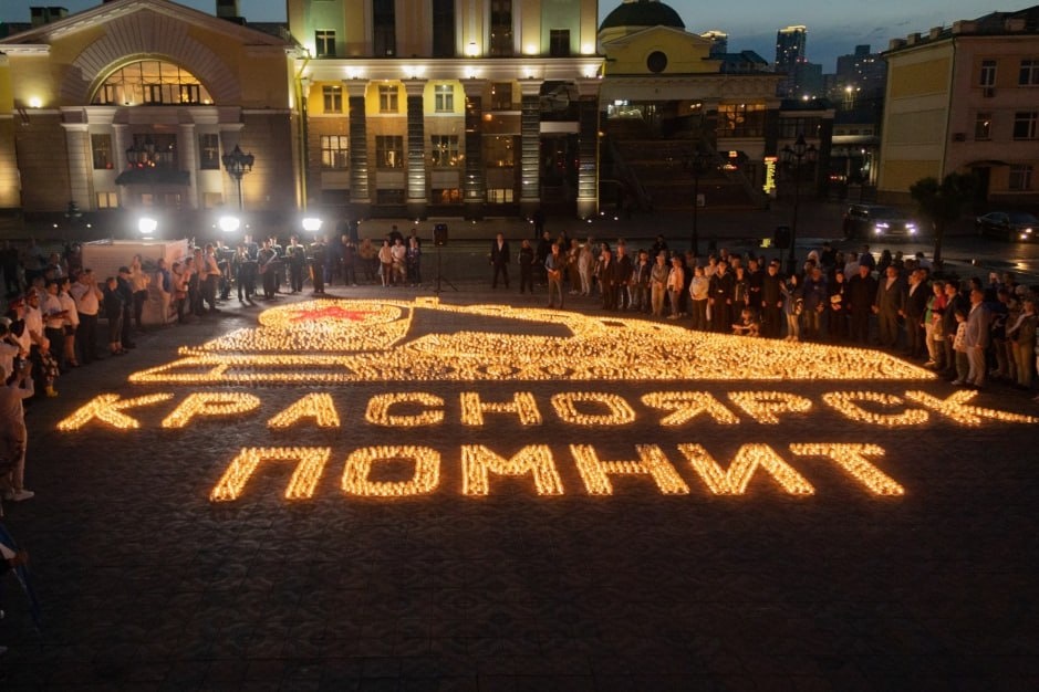 Вечером, в 20:00 на площади Победы пройдет акция «Свеча памяти». Из лампад и свечей красноярцы выложат журавлей и слова: «Красноярск помнит».