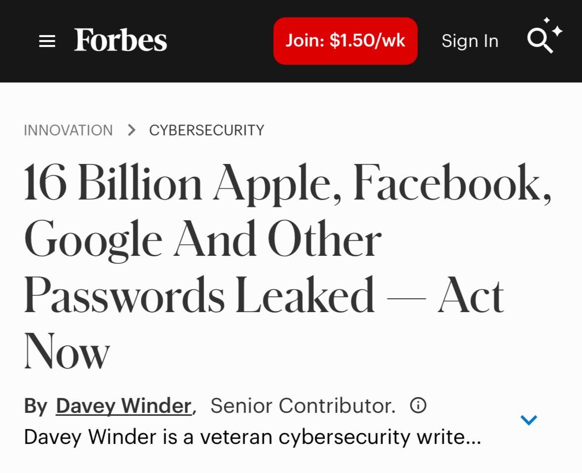 В сеть слили 16 миллиардов логинов и паролей от аккаунтов Apple, Google, Instagram, Facebook, GitHub — это крупнейшая утечка за всю историю человечества, Пишет Forbes. Среди них могут быть данные более 455 млн аккаунтов из России.