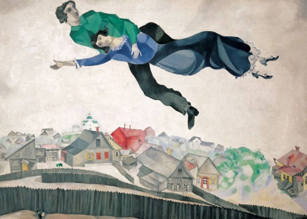 Главные герои картины – влюбленная пара, парящая над городом. Этот полет символизирует чувство свободы, легкости и счастья, которое дарит любовь. Они словно оторвались от земли, от обыденности и проблем, вознесясь в мир грез и мечтаний, созданный их любовью.