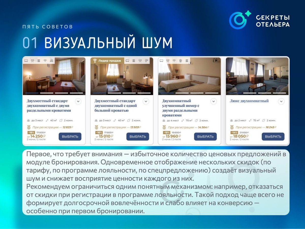 На этой неделе мы разобрали очередной модуль бронирования - и в этот раз сосредоточились на ценообразовании. Иногда, даже если модуль выглядит аккуратно и современно, его внутренние настройки не работают на рост дохода. Где-то скидки пересекаются друг с другом, где-то ограничения мешают продать номер, а где-то цены не отражают реальную ценность категории. Пять простых наблюдений - и столько же точек роста. Делимся своим взглядом со стороны и напоминаем: 😁Участвуйте в рубрике, пройдя бесплатный экспресс-анализ вашего модуля бронирования и повышайте свои продажи! Для участия напишите комментарий под этой публикацией и мы свяжемся с вами. 😁Советы, даваемые в рубрике, не являются критикой и не могут быть обязательны к исполнению, это лишь мнение со стороны, с которым можно соглашаться или нет. #5советов #модуль_бронирования