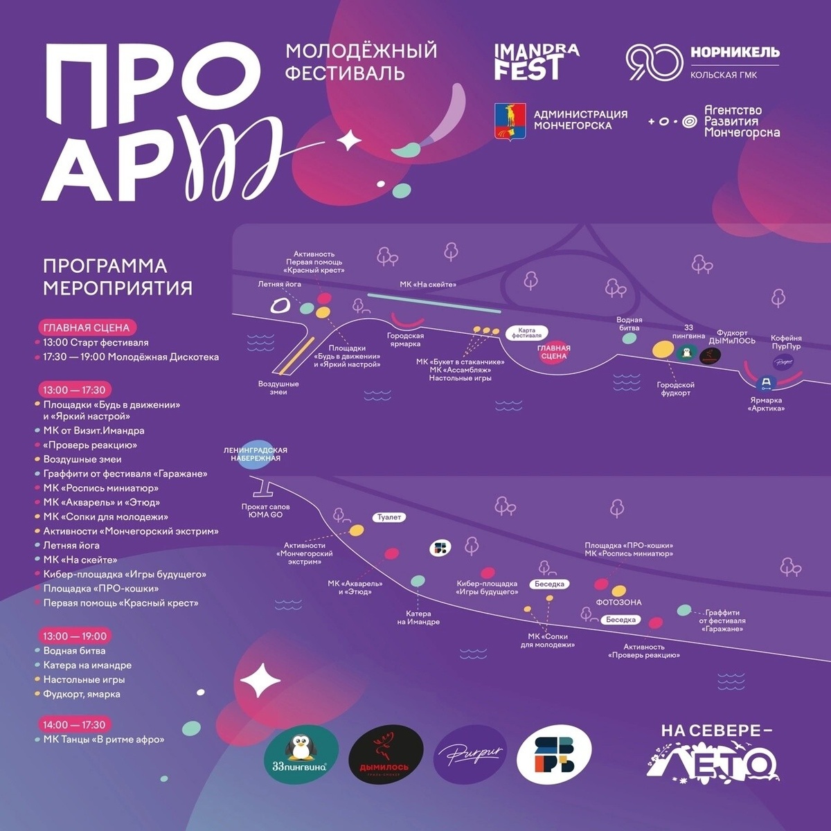 🤩 Молодежный фестиваль «Про Арт» 2025 собирает гостей в Мончегорске В площадку для творчества и свободы превратится Ленинградская набережная в Мончегорске в субботу, 21 июня. Берите друзей и приезжайте! С 13 до 19 часов здесь будет проходить ежегодный молодежный фестиваль «Про Арт» в рамках круглогодичного Imandra Fest. Водная битва, настольные игры, скейт-зона, летняя йога, граффити, множество мастер-классов, вечерняя дискотека под открытым небом и новые друзья - все, что нужно, чтобы ворваться в лето. На фестивале «ПроАрт» откроется пространство для самовыражения и креатива: от уличного граффити до медитативной акварели. Можно собрать букет в кофейном стаканчике, расписать миниатюру или попробовать технику ассамбляжа, сообщают организаторы. Любителям активного отдыха - насыщенный водный блок: гонки на радиоуправляемых катерах, битва на водяных пистолетах и релакс-прогулка на сапбордах по Имандре. Отдельные зоны посвятят здоровью и движению: летняя йога, скейт-зона, танцевальные