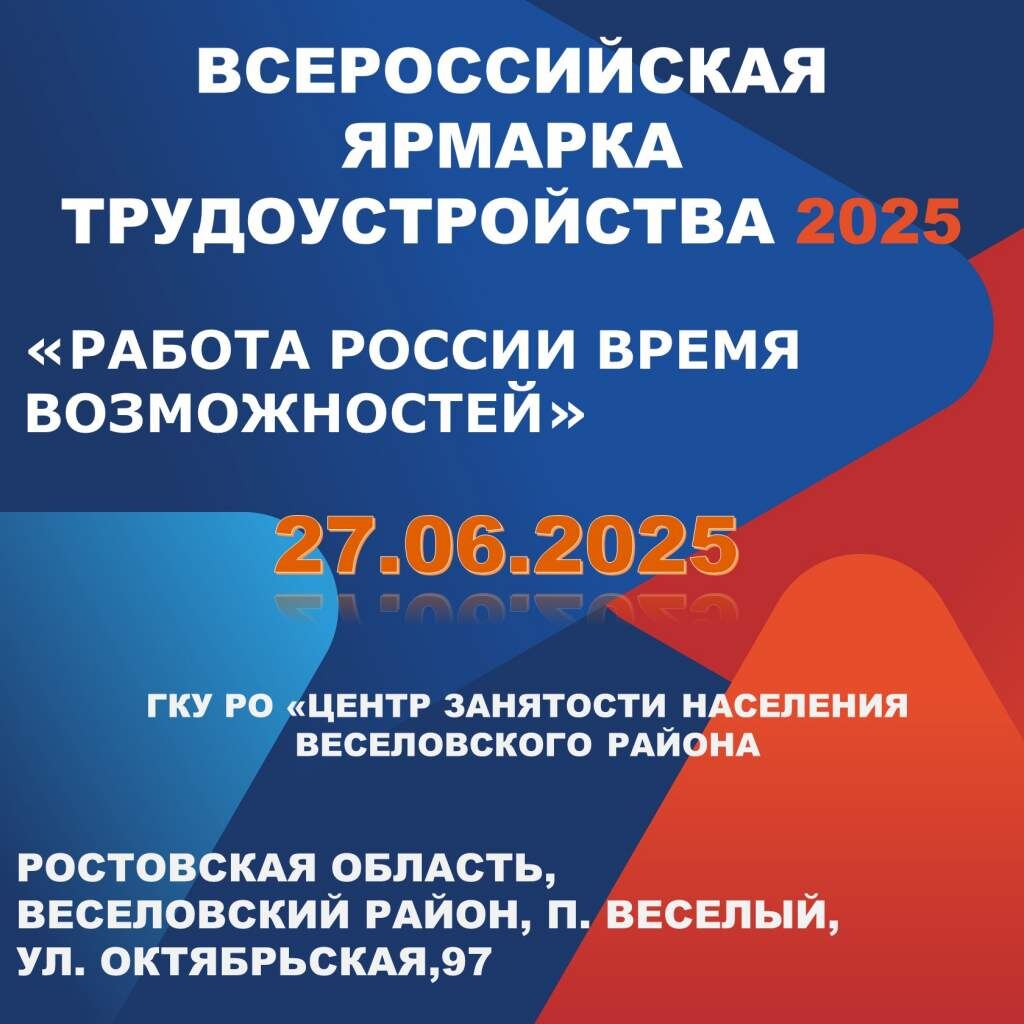 Центр занятости населения Веселовского района приглашает граждан принять участие во Всероссийской ярмарке вакансий «Работа России. Время возможностей» 2025. Данное мероприятие предоставляет возможность для соискателей познакомиться с актуальными вакансиями, задать вопросы работодателям и получить необходимую информацию о востребованности рынке труда. В мероприятии примут участие работодатели различных отраслей, которые готовы обсудить возможности трудоустройства и предложить интересные вакансии. Мы уверены, что каждый сможет найти подходящую работу и сделать шаг навстречу новым профессиональным достижениям. Ярмарка вакансий состоится 27 июня с 10-00 до 15-00 по адресу: п. Веселый, ул. Октябрьская, 97.