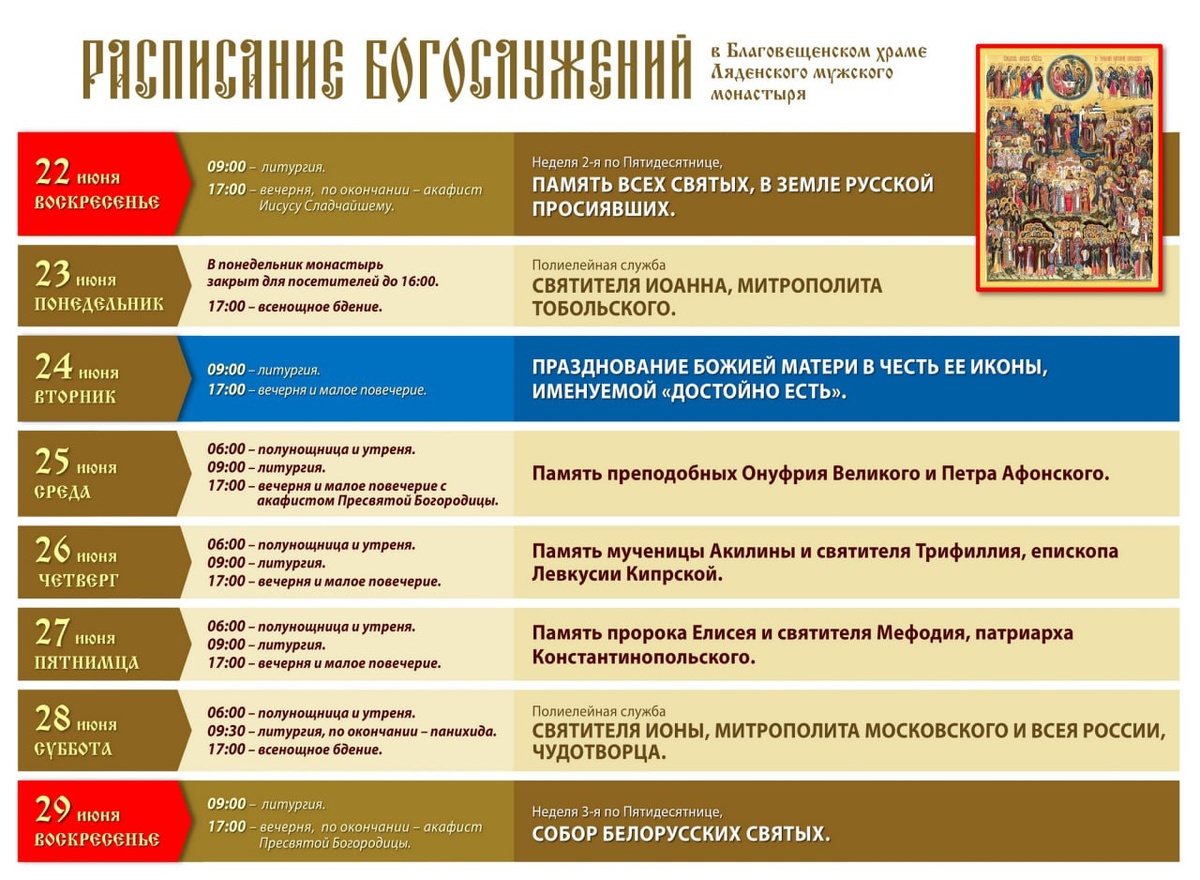 Расписание богослужений в Ляденском монастыре 22-29 июня 2025 г