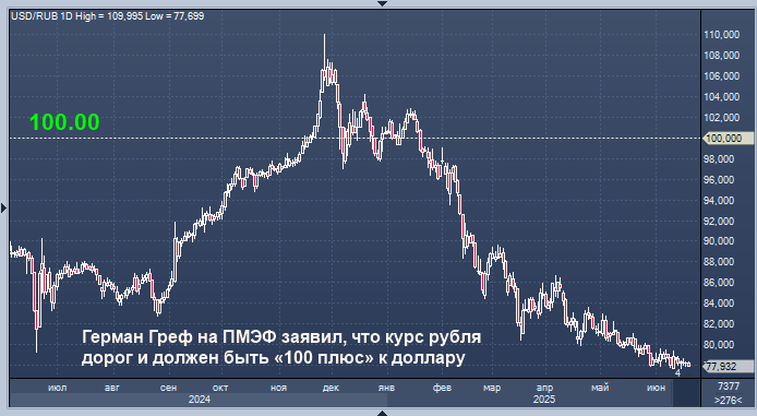 Экспорт и бюджет в проигрыше, заявил глава Сбера Курс доллара к рублю расчётный, фьючерс, вечный фьючерс и межбанк. Курс евро к рублю расчётный, фьючерс, вечный фьючерс и межбанк. Курс юаня к рублю биржевой, фьючерс, вечный фьючерс и межбанк. Герман Греф в ходе ПМЭФ заявил, что сейчас курс рубля по отношению к доллару занижен, равновесным курсом является курс «100 плюс». «Мы сегодня имеем курс на уровне 78-79 руб. за доллар. Это ощущают на себе, конечно, очень сильно все наши экспортные отрасли и, в первую очередь, бюджет. Мы видим, что бюджет сталкивается с повышенным дефицитом, и в конце года очевидно, что министерство финансов встанет перед необходимостью покрытия дефицита новыми источниками», — предположил Греф. MarketSnapshot - ProFinance.Ru в Telegram В России «нет никакого "навеса" депозитов», ставку снизим вслед за инфляцией — Набиуллина Мантуров считает оптимальным для экспортеров и импортеров курс на уровне 100 руб./$ Костин: уровень, до которого укрепился рубль, вредный, над